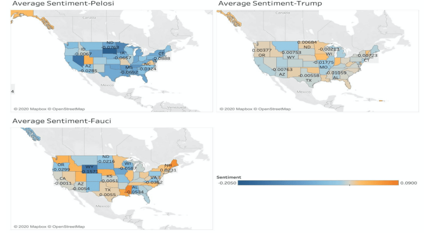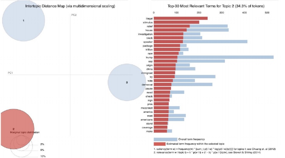 We focus the analysis on three politicians who are active and leading government figures in COVID-19 related news, namely, Speaker Nancy Pelosi, President Trump, and the director of the National Institute of Allergy and Infectious Diseases (NIAID), Dr. Fauci. The model used for topic modeling is LDA, and we select the “best number of topics” parameter by reviewing the Intertopic Distance Map and the most relevant terms chart so that each topic is discriminant.
