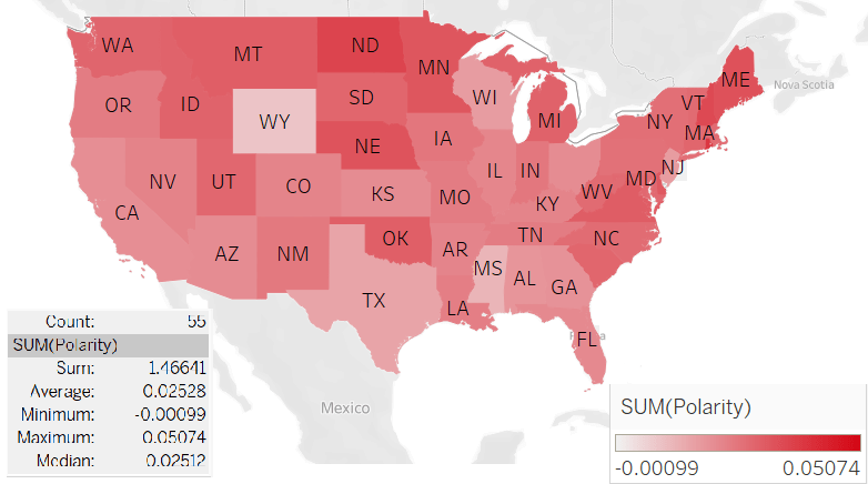Surprisingly, we did not find a relationship between the states with the highest positive cases and the states with the highest tweet frequency. Thus, we would like to explore possible relationships between the sentiment of tweets in each state. We ran sentiment analysis and generated sentiment score for each states.