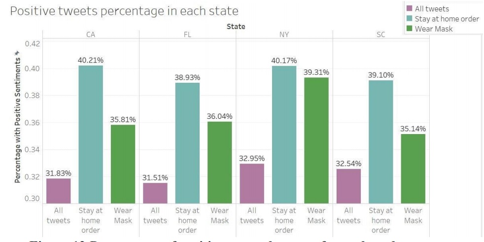 Among four states, New York has a higher percentage with positive tweets (32.95%) while Florida has the lowest percentage with positive tweets (31.51%). We can see a dramatic increase in the percentage of positive tweets towards the two policies in each state, in general, people have a more active response to the government policies. In New York, up to 40.17% of tweets show a positive attitude towards the stay-at-home order. However, when we take a look at the differences between the two policies, we see a generally less active response to wearing masks compared with the stay-at-home order. This is in line with what we observe in daily life and it also reflects the fact that Americans are less accustomed to or willing to wear masks.