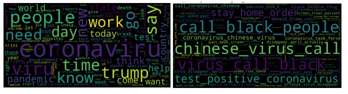 We scraped over 20 million tweets related to COVID-19 from March to June 2021 using Python. Initially, we generated N-gram word clouds to gain a general overview of the public response to COVID-19. With President Trump controversially referring to COVID-19 as “the Chinese Virus” in recent events, there has been increased discussion about China. Additionally, the term ‘Black people’ emerged as a significant topic in the tweets.