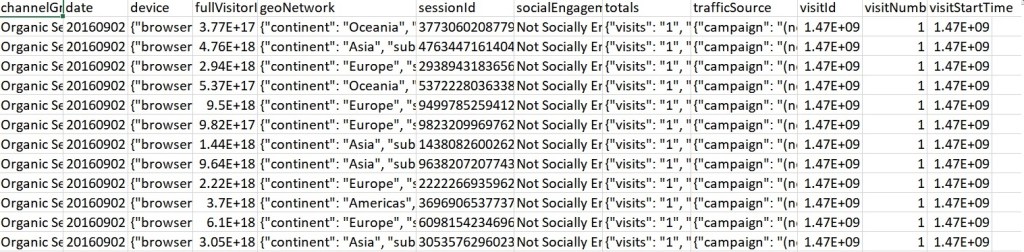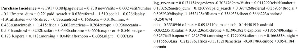 The data was collected from 2016 to 2017, train dataset (903,653 observations and 55 variables) dataset are given in JSON string and test dataset (804,684 observations and 53 variables) is used for revenue predictions.Thus, we decided to use a logistic regression model to determine the most important variables in predicting purchase probability. Then followed this model with a semi-log linear regression to predict transaction revenue.