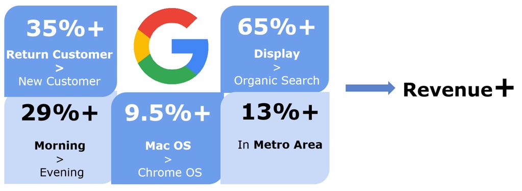 In consistent with our analysis before, for channel, if a customer are accessing our website through Display channel, 65% more revenue are stimulated compared to people who are from organic search.